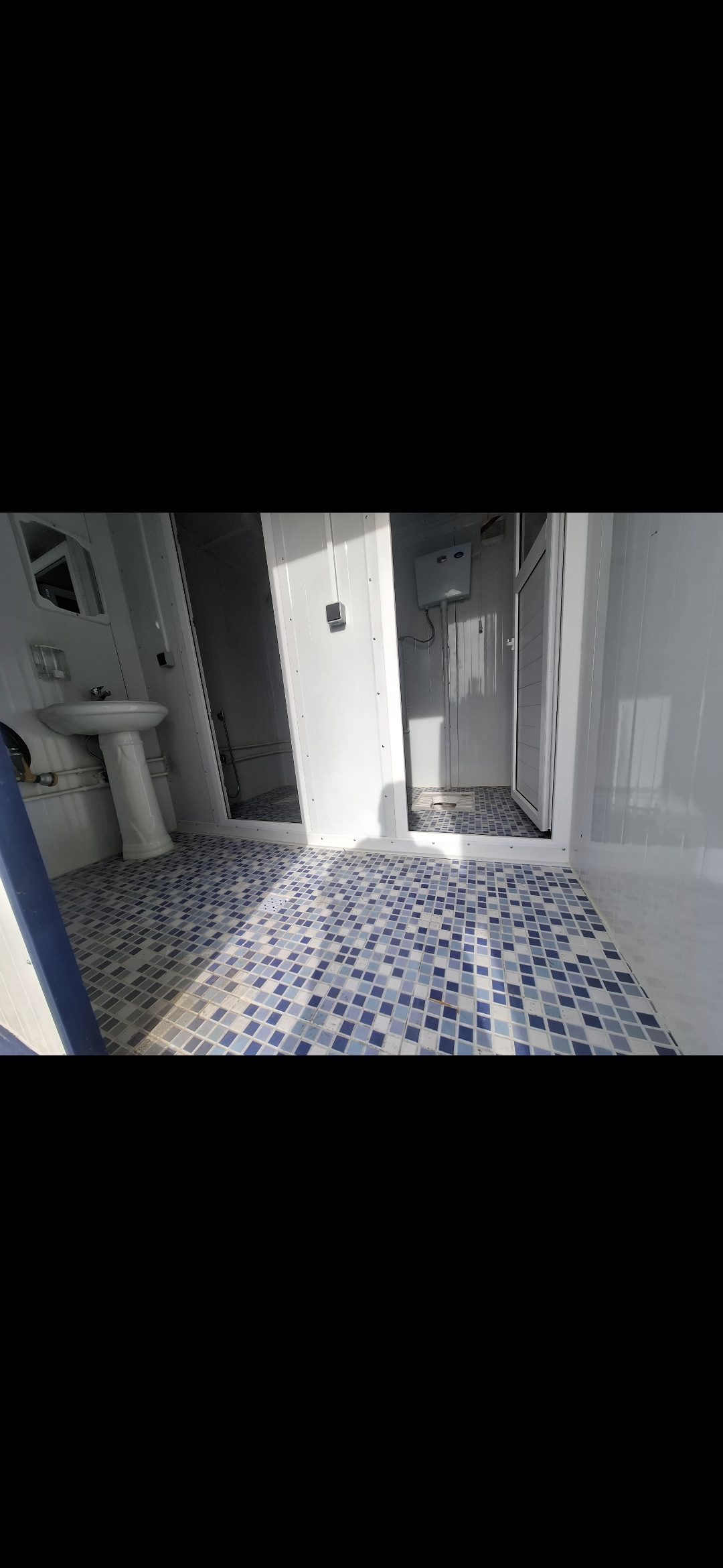 کانکس دوچشمه سرویس و حمام راهرودار می باشد ، دارای تجهیزات کامل شامل آینه جامایع برق کشی لوله کشی سرد و گرم